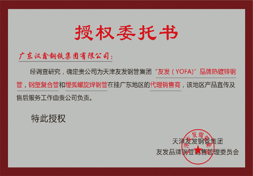 “友发”牌商标于2008年3月被国家工商总局商标局认定为“中国驰名商标”,“友发”牌直缝焊管、热镀锌钢管、螺旋焊管,连续多年被天津市政府授予“天津市名牌产品”称号。天津友发钢管集团连续10年跻身中国企业500强、中国制造业500强之列,2015年,天津友发钢管集团位列中国企业500强第400名,中国制造业500强第203名,中国民营企业500强130名.