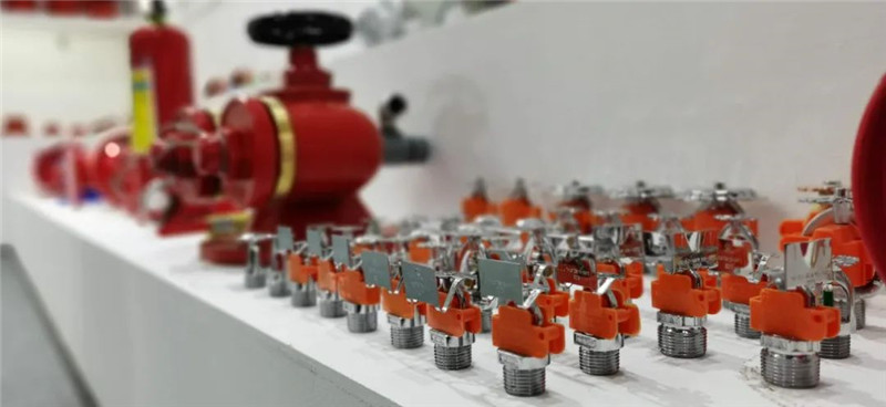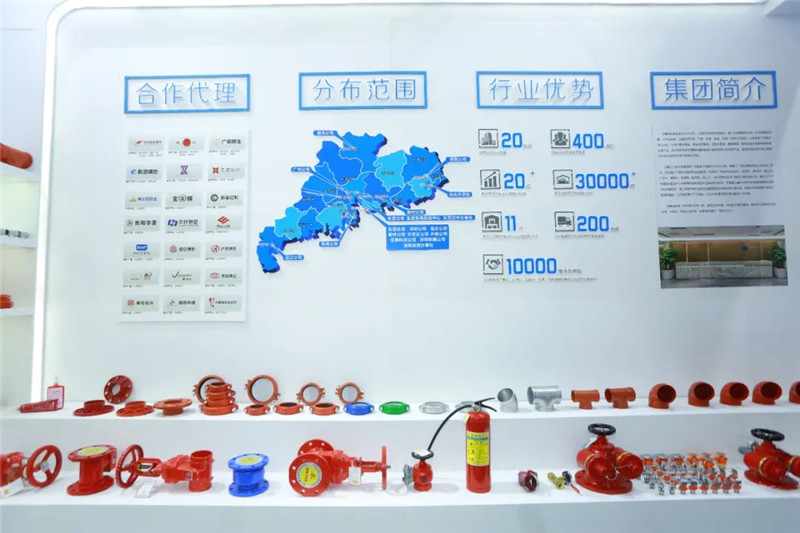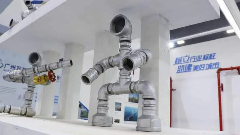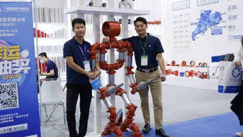 在特装展示区,我们特别选用了百安品牌的消防器材、钰兴品牌管件与镀锌钢管组装搭建了一个消防系统上的局部小场景展示。