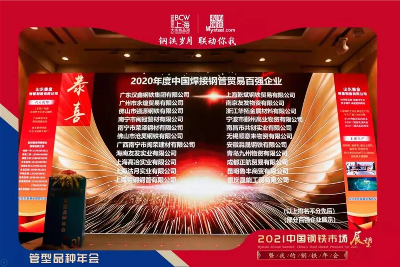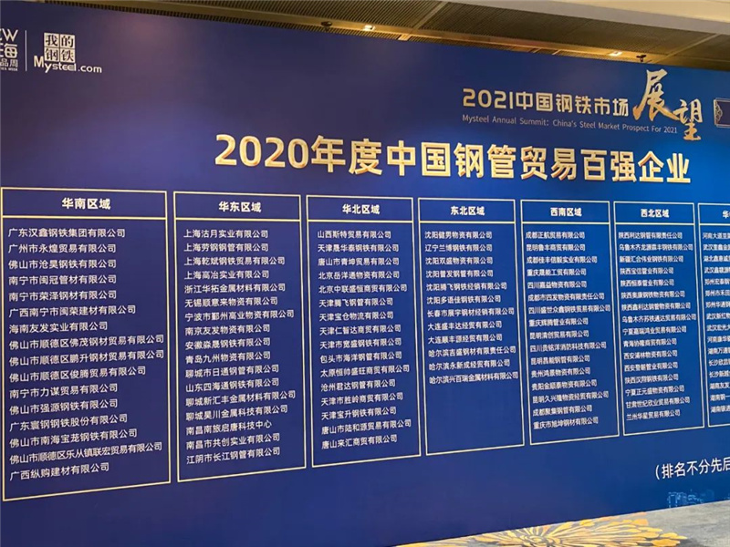 【千亿官方网页版登录入口荣誉】2020年度中国钢管贸易百强企业!