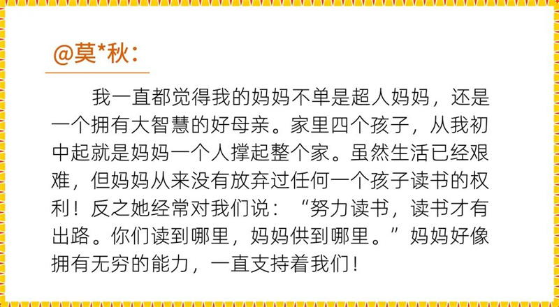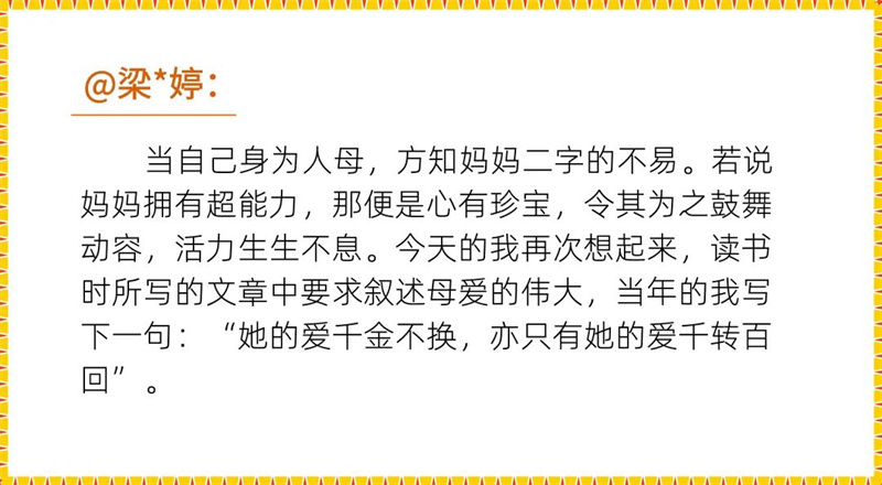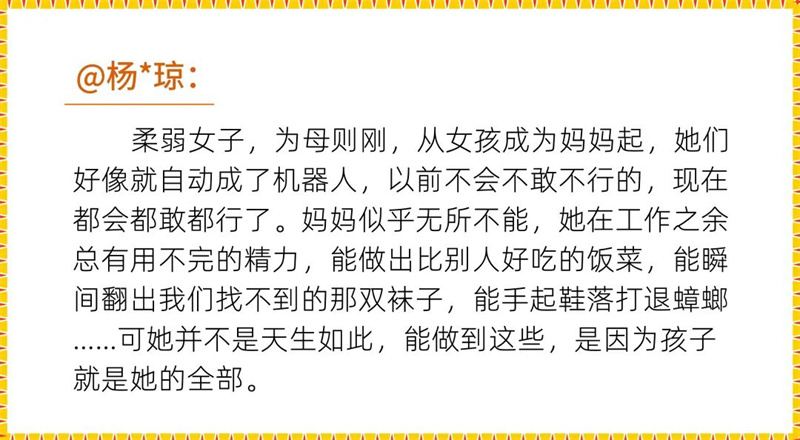 母亲节,千亿官方网页版登录入口推出“妈妈的超能力”主题征集活动,晒出自己最了不起的超人妈妈,回忆成长过程中妈妈对家庭、对孩子们的付出,细数自己成为母亲后,对母爱的全新体会。这些蕴含真情实感的文字,是世上最美的诗篇: