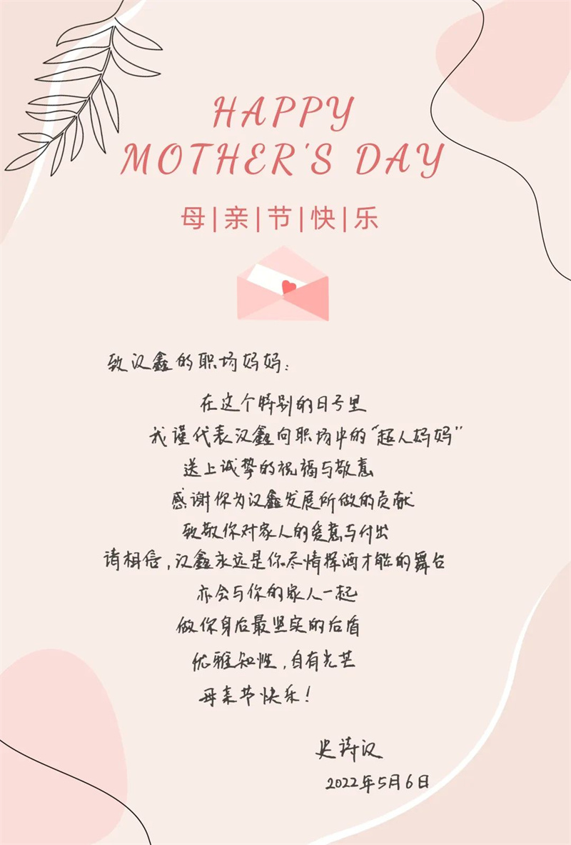 除了来自家人的爱意,她们同样应该拥有来自工作的认可与感激。母亲节之际,董事长史诗汉先生在节日贺卡上,为千亿官方网页版登录入口的职场妈妈写下寄语,感谢她们为千亿官方网页版登录入口所做的贡献,祝每位超人妈妈优雅知性,自有光芒。