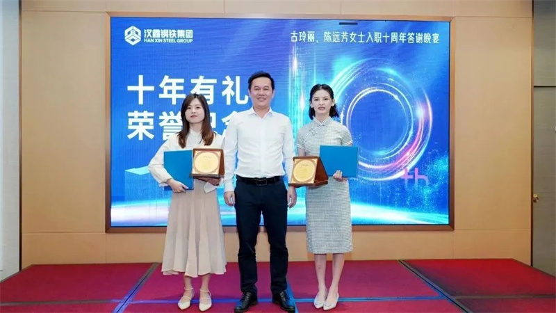 运营部总经理林文杰为古玲丽、陈远芳颁发十周年纪念册及荣誉牌,纪念她们在千亿官方网页版登录入口走过的十年岁月。