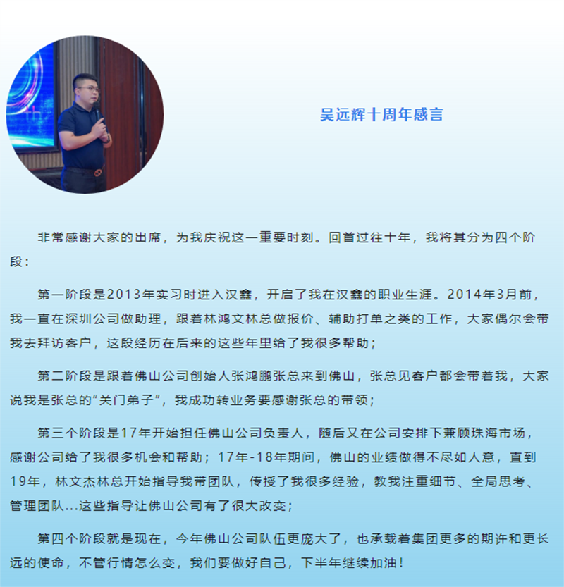 每一个全身心投入工作、拼搏事业的员工背后,都离不开身后坚定支持的家人。十年间,为了佛山公司创立、发展,吴远辉付出了诸多精力,他的家人也给予了他最大的鼓励和理解。运营总经理林文杰为吴远辉家属代表送上纪念礼品,并代表千亿官方网页版登录入口致以诚挚谢意。