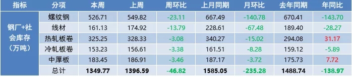 数据显示,本周五大品种库存总量为1349.77万吨,环比累降46.82万吨。其中建材方面,总库周环比下降36.9万吨。板材方面,总库周环比下降9.92万吨。可见,板材较上周相比降库在差强人意的基础之上,也处于降幅收窄趋势。