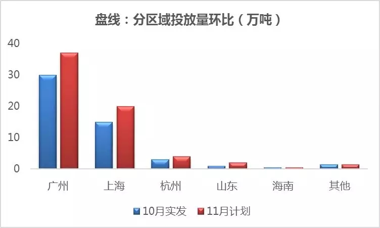 11月份盘线投放:广州计划投放37.0万吨,环比10月份增加7.0万吨,同比增加97%,上海计划投放20.0万吨,环比增加5.0万吨。