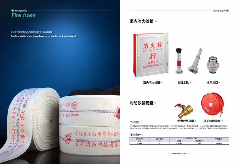 常规产品: 800*650*240箱、8型-DN65水带、DN65*0.8MM软管卷盘、DN65水枪、DN65接扣、DN65室内栓;手提式/推车式干粉灭火器、手提式二氧化碳灭火器等。