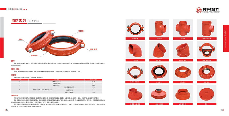 2、沟槽式管接头及管件主要包括:刚性管接头、柔性管接头、转换法兰、分体法兰、正三通、异径三通、正四通、异径四通、变头、机械三通、机械四通、大小头、盲片等系列。